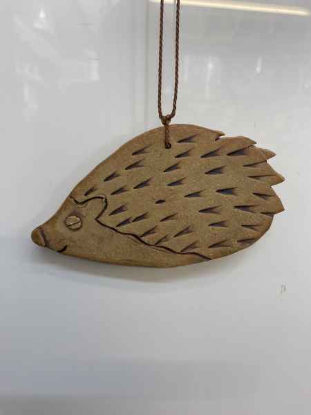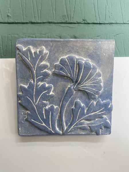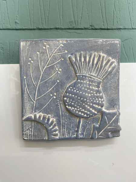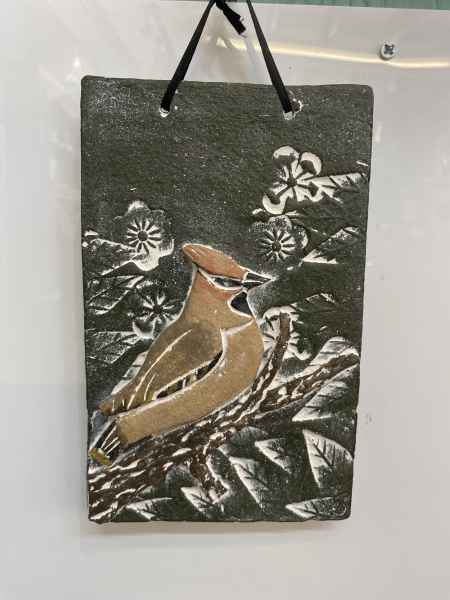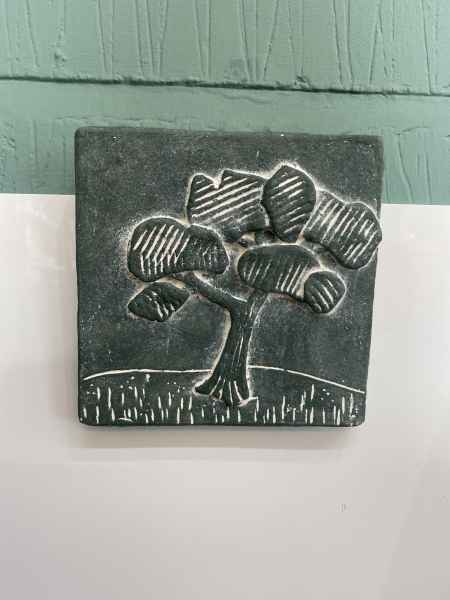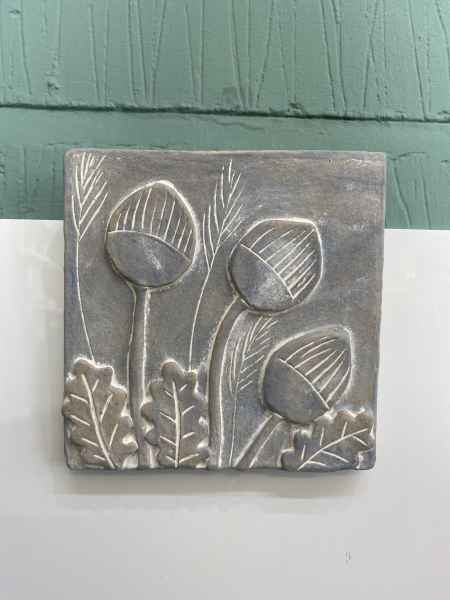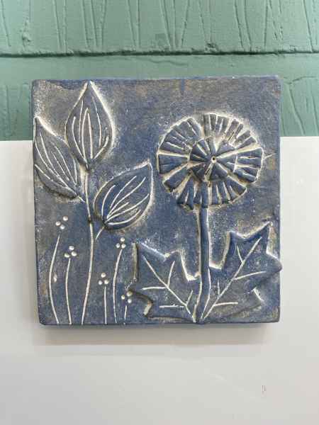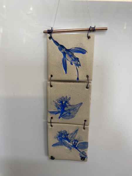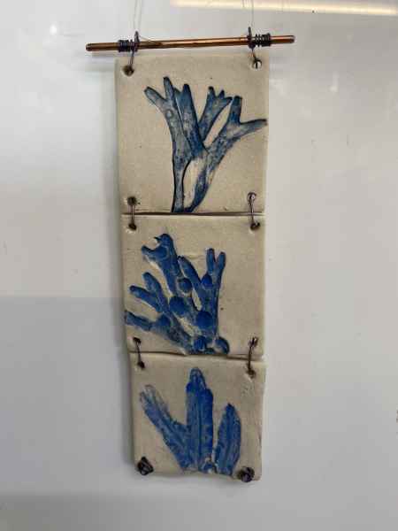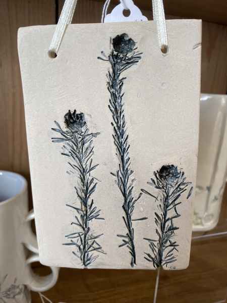 Dawn’s more intricate smaller works are decorated using nature printing (NP) techniques and often stained to enhance the detail. Combined with her love of intricate stitched designs, this led her to create her first NP printed, small, sewn-together clay tiles as part of an embroidery exhibition. These hanging tiles are still one of her most popular creations. Her work with the NP Society in USA has led to her printing on wood and seaweed.