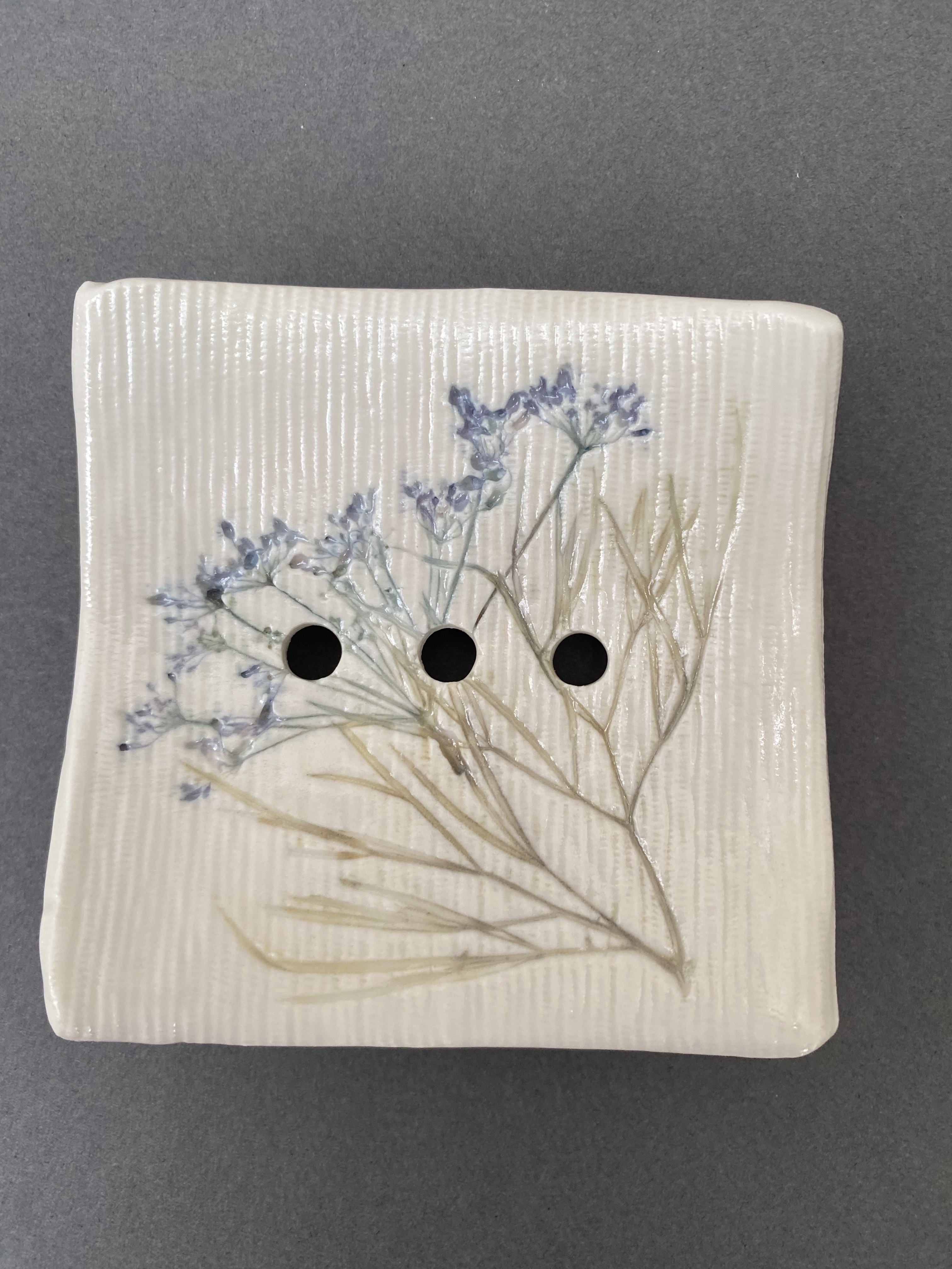 Ceramic Soap Dish Approx dimensions 100mm x 100mm H = 25mm The UK delivery prices can be viewed once the item has been added to your basket. For overseas orders, please let us know through the website using the Contact form.
