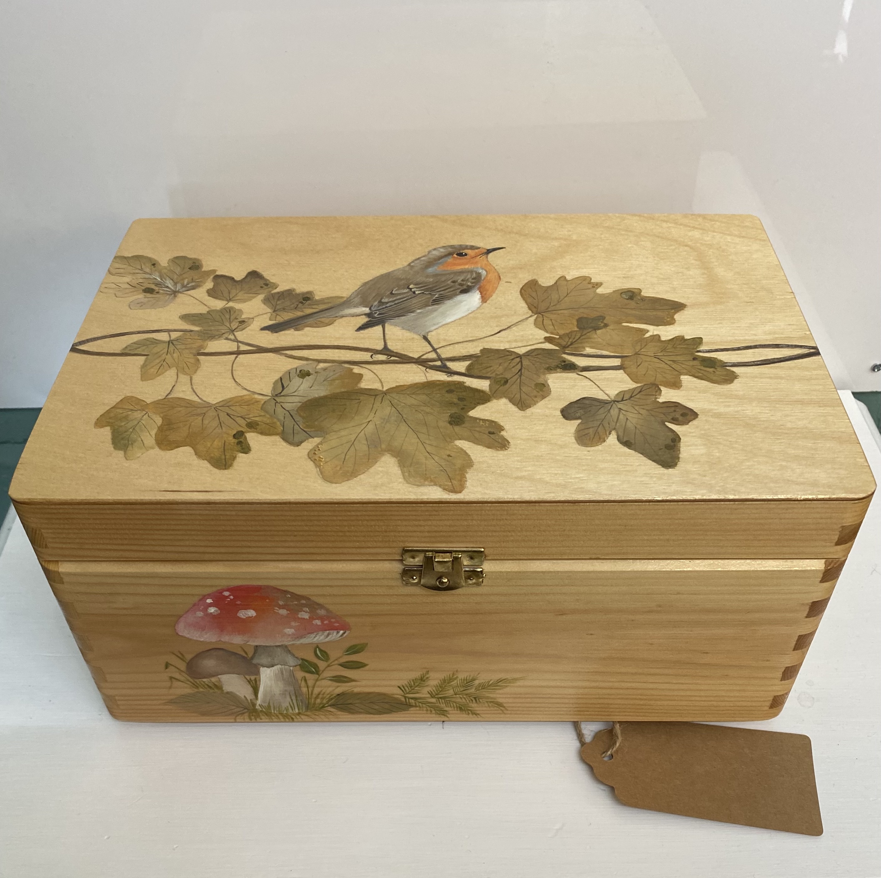 The pine boxes are sanded until smooth enough for acrylics.  Each design is carefully created on the box lid with the featured bird prominent within its detailed natural setting.  The painting flows through to the front of the box to provide added interest and continuity. Two protective coats of varnish are applied with further sanding in between to maintain the smooth feel.  No detail is spared in the painting and the gloss varnish draws out the colour beautifully, as well as proving that extra shine.