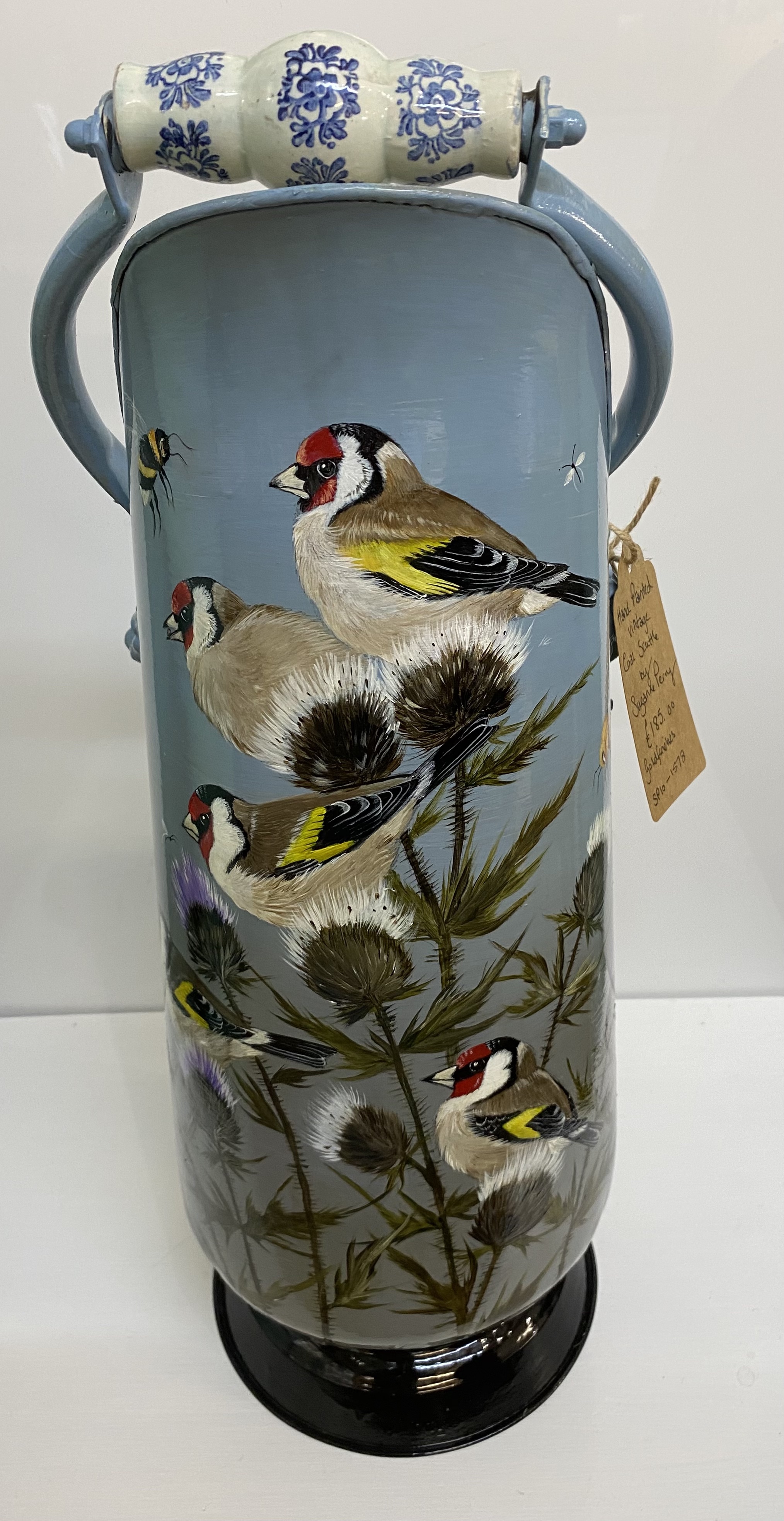 Coal scuttles are usually made of brass or copper, treated for any rust before covering with two coats of base primer as recommended by paint manufacturers. The background colour is carefully chosen to suit the particular design. The bird is subsequently painted in acrylic to the level of detail I apply to my traditional paintings. After drying, the finishing and protection will be achieved by two coats of varnish, which brings out the colours even more.