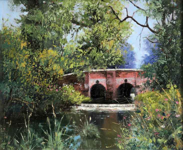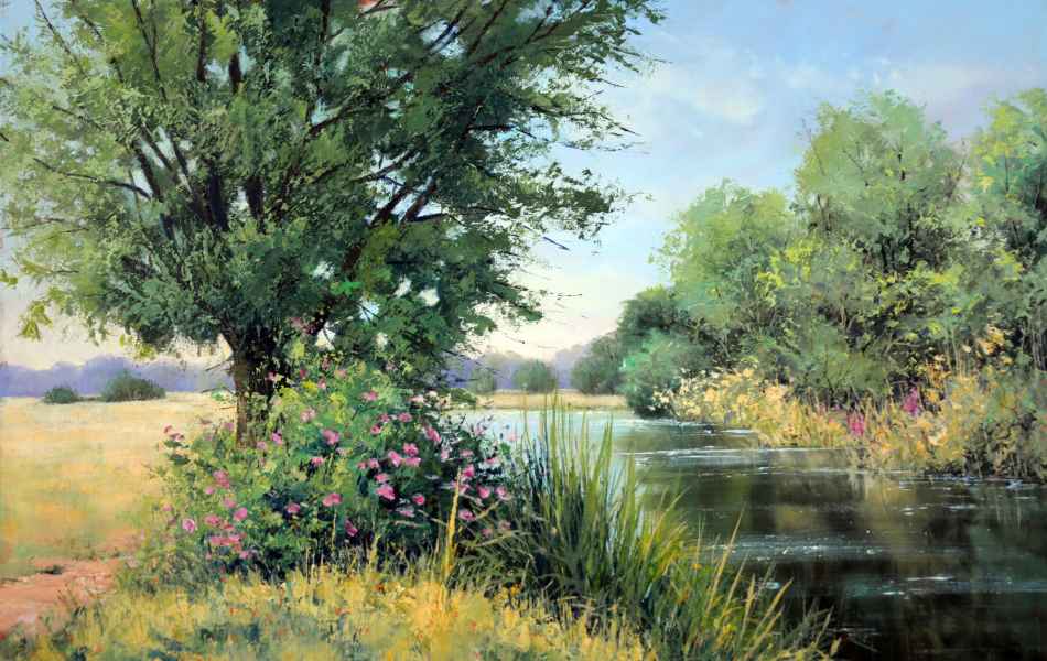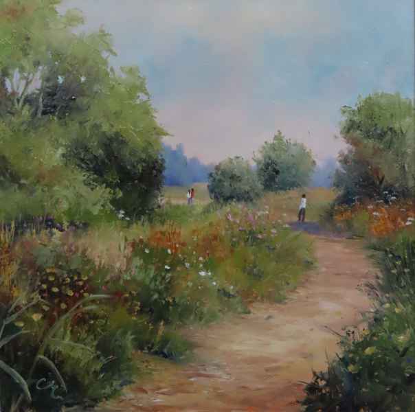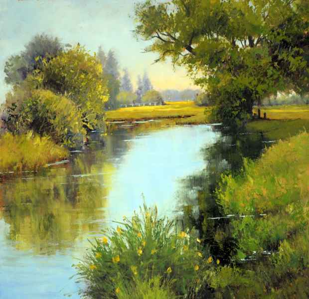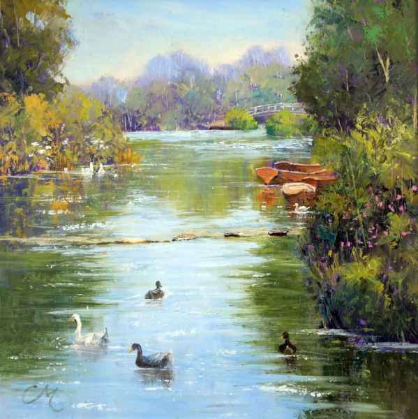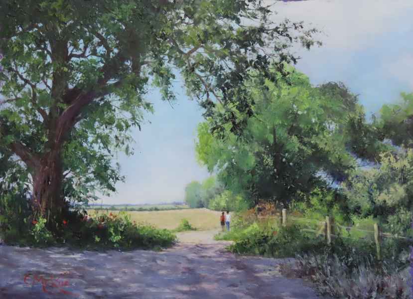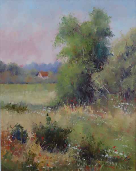 She is most content working en plein air to capture the scene before her, and uses painting knives to give her work a fresh and loose approach on traditional landscapes, a technique that also works well on larger studio pieces.