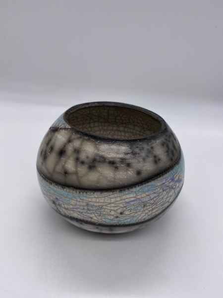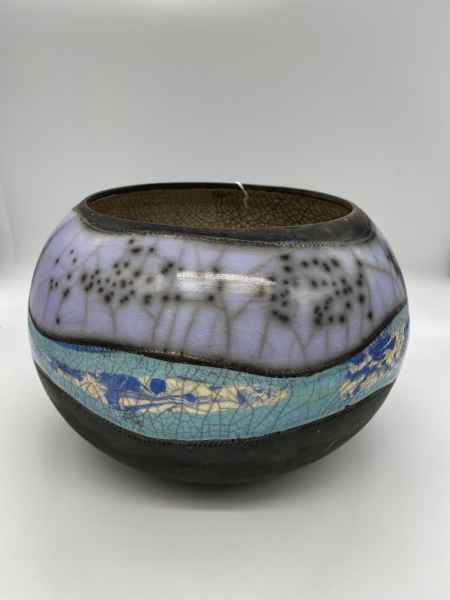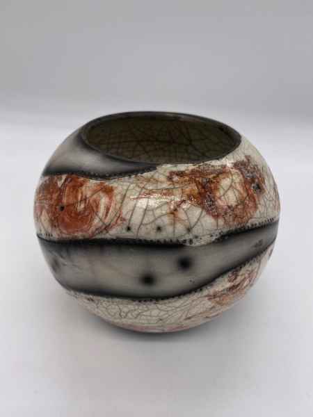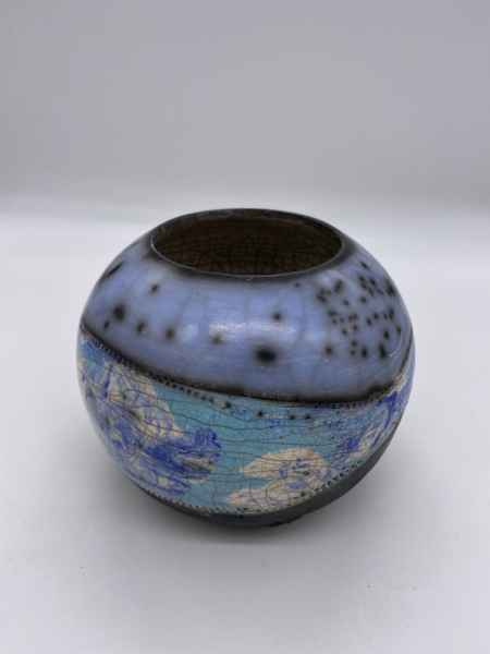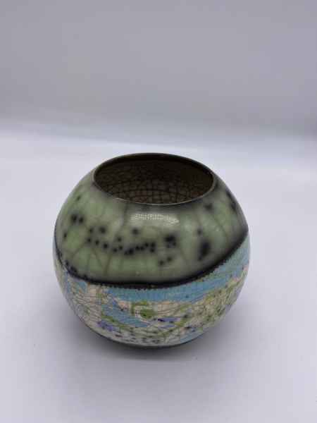 Michelle's raku work consists of a range of both "naked" and glazed raku vessels and is inspired by photographic images of planet earth as seen from the International Space Station as well as from recent images of Jupiter from NASA's Juno cam. Forms are wheel thrown, then decorated with terra sigillata slips. Layers of decoration are used to illustrate surfaces in a two dimensional way, as would be seen from outer space. Some pieces are then burnished, some glazed. Raku fired wares are usually still porous after firing, but some of my small "planets" and bottle shapes have been sealed to make them water tight for flowers. Last year one of Michelle's "earth" pots was bought by a customer working for the European Space Agency in the Netherlands. She also had the opportunity to meet ESA Astronaut Tim Peake and was able to gift him a piece of her work, which was inspired by his amazing photography from the international Space Station.