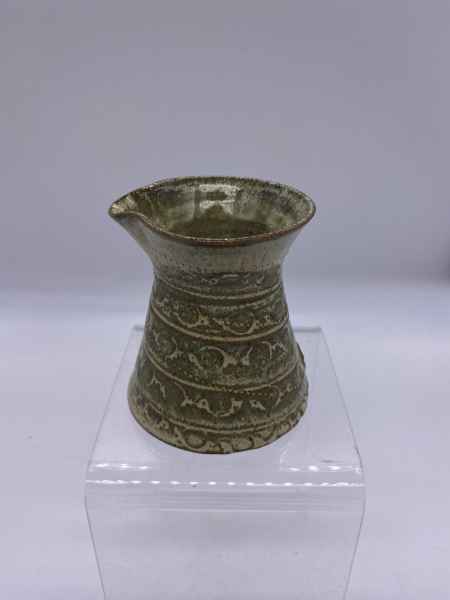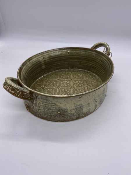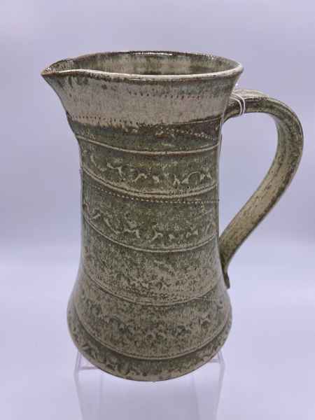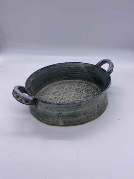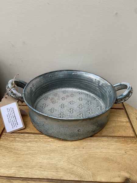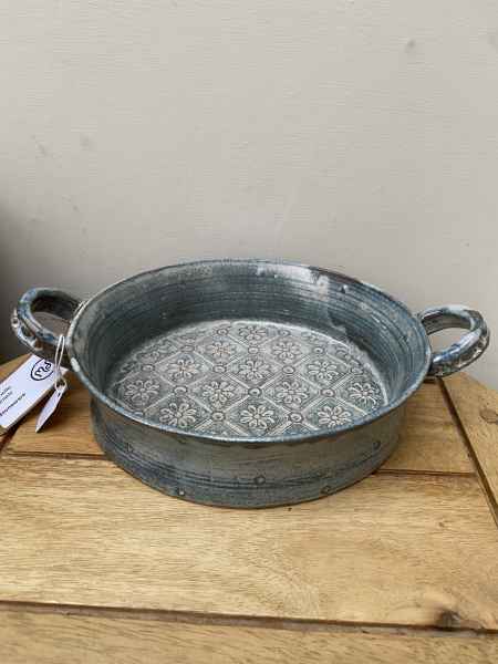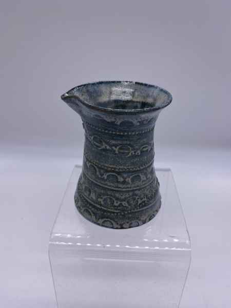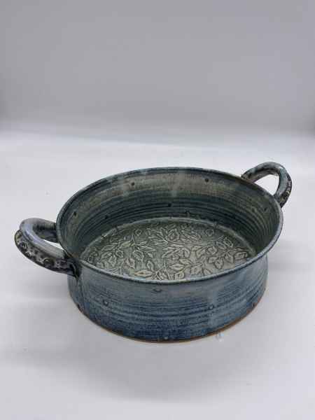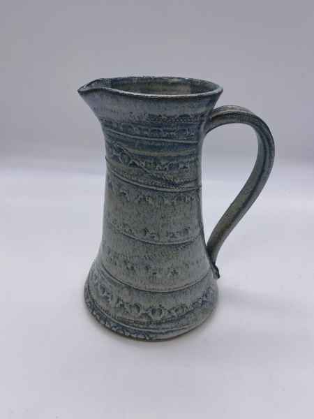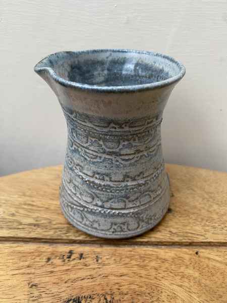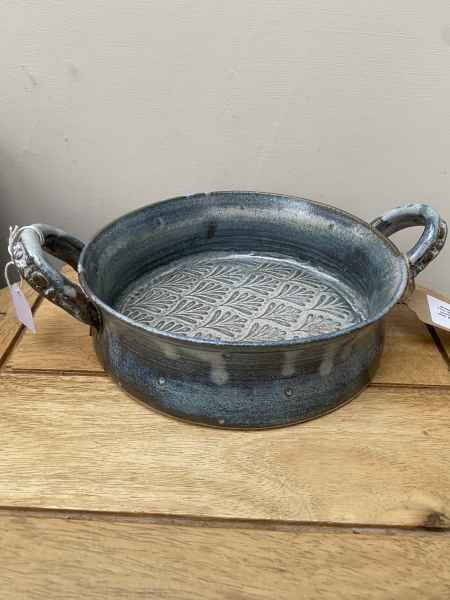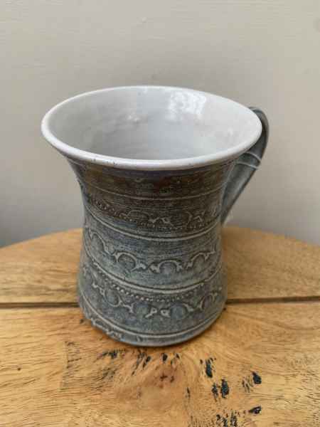The pots in her stoneware range are individually wheel thrown. Each piece is impressed with stamps, cogs, buttons and roulette wheels, which form pattern on their surface. They are then glazed with her own glazes to enhance their textural surfaces and fired to stoneware temperatures, making them durable, functional pieces designed for everyday use. They can be put in the dishwasher if required.