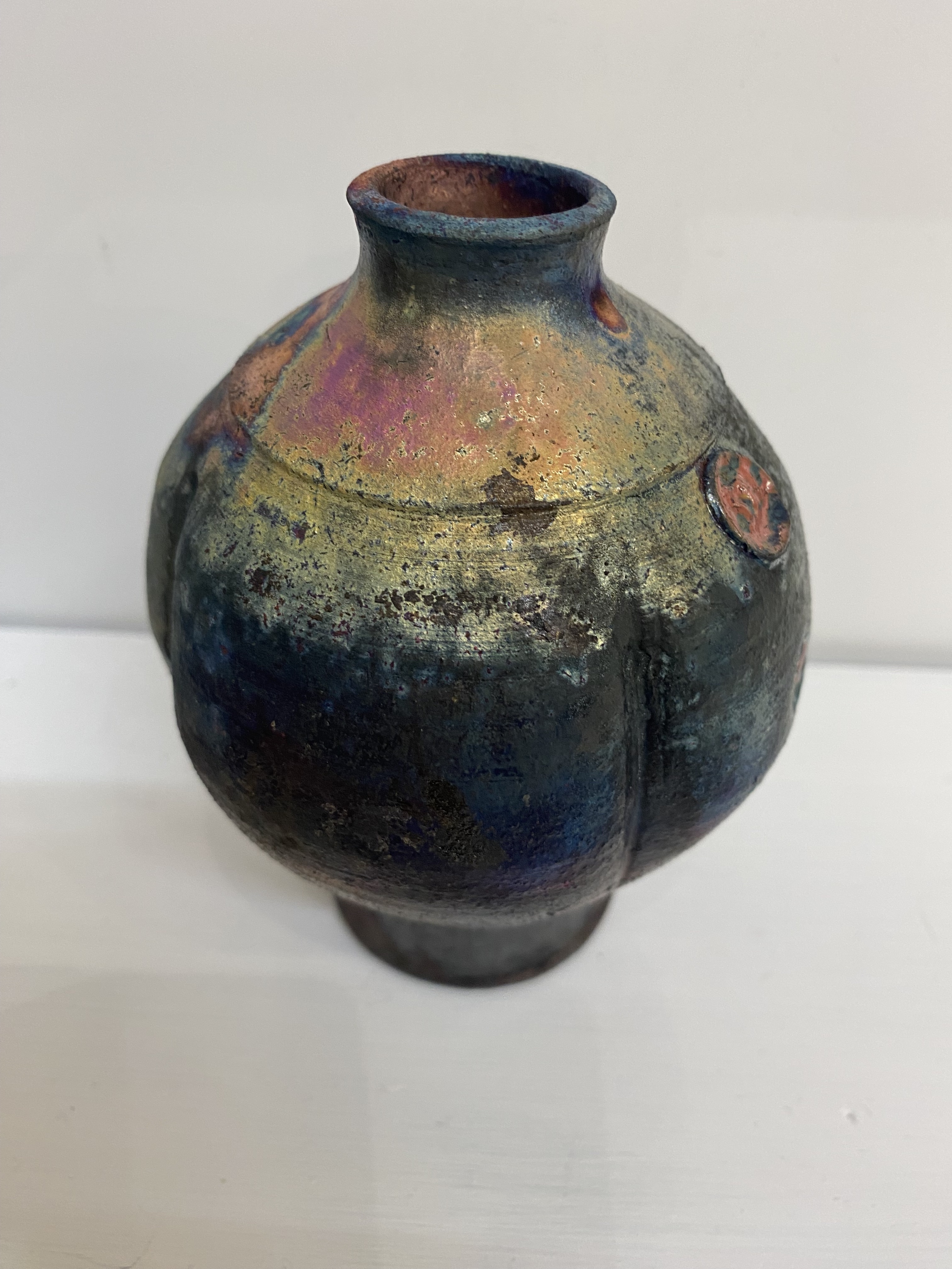 Handmade Raku. Approx dimensions H= 130mm D = 25mm ( at neck )