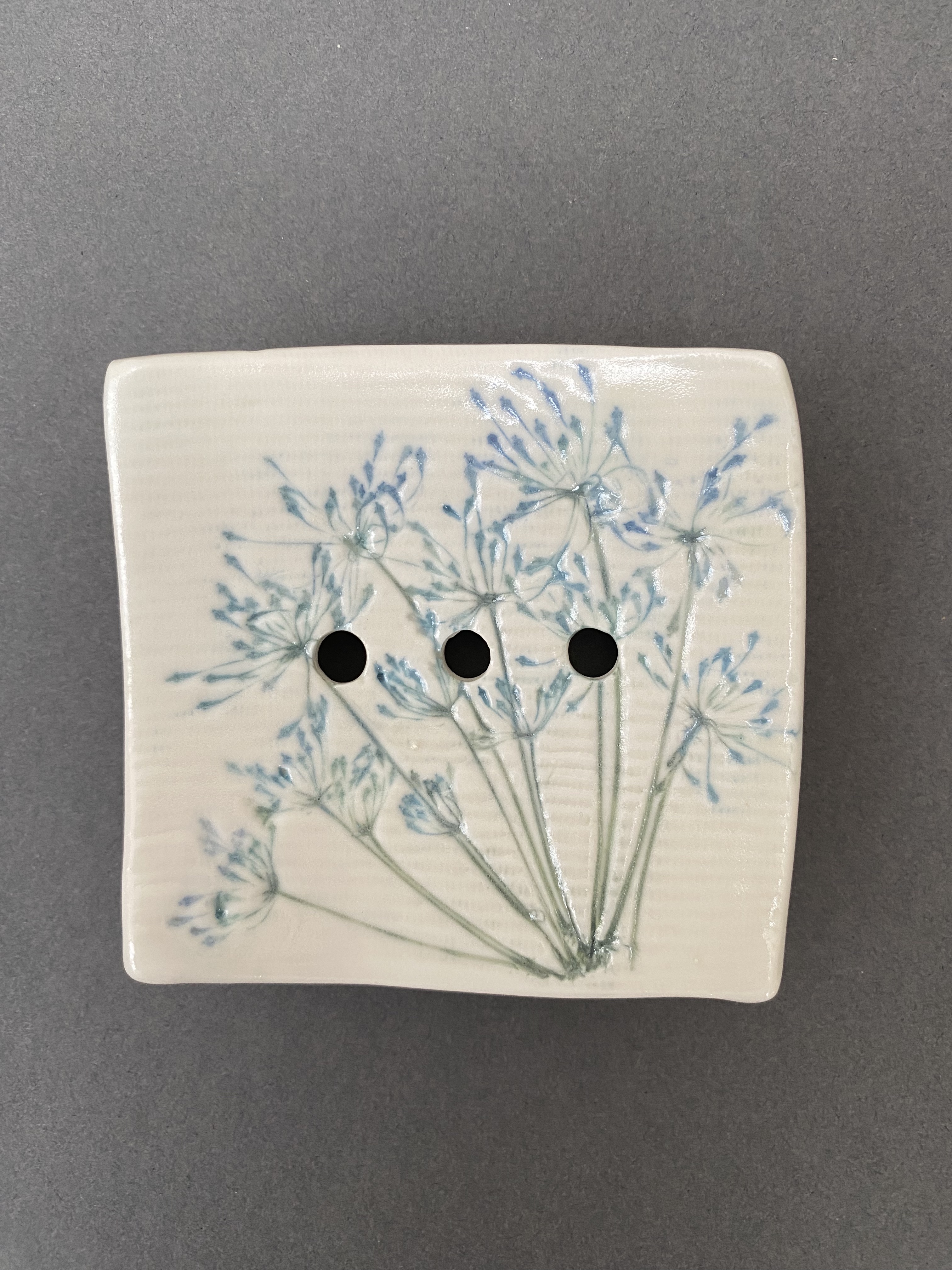 Ceramic Soap Dish Approx dimensions 90mm x 90mm H = 25mm The UK delivery prices can be viewed once the item has been added to your basket. For overseas orders, please let us know through the website using the Contact form.