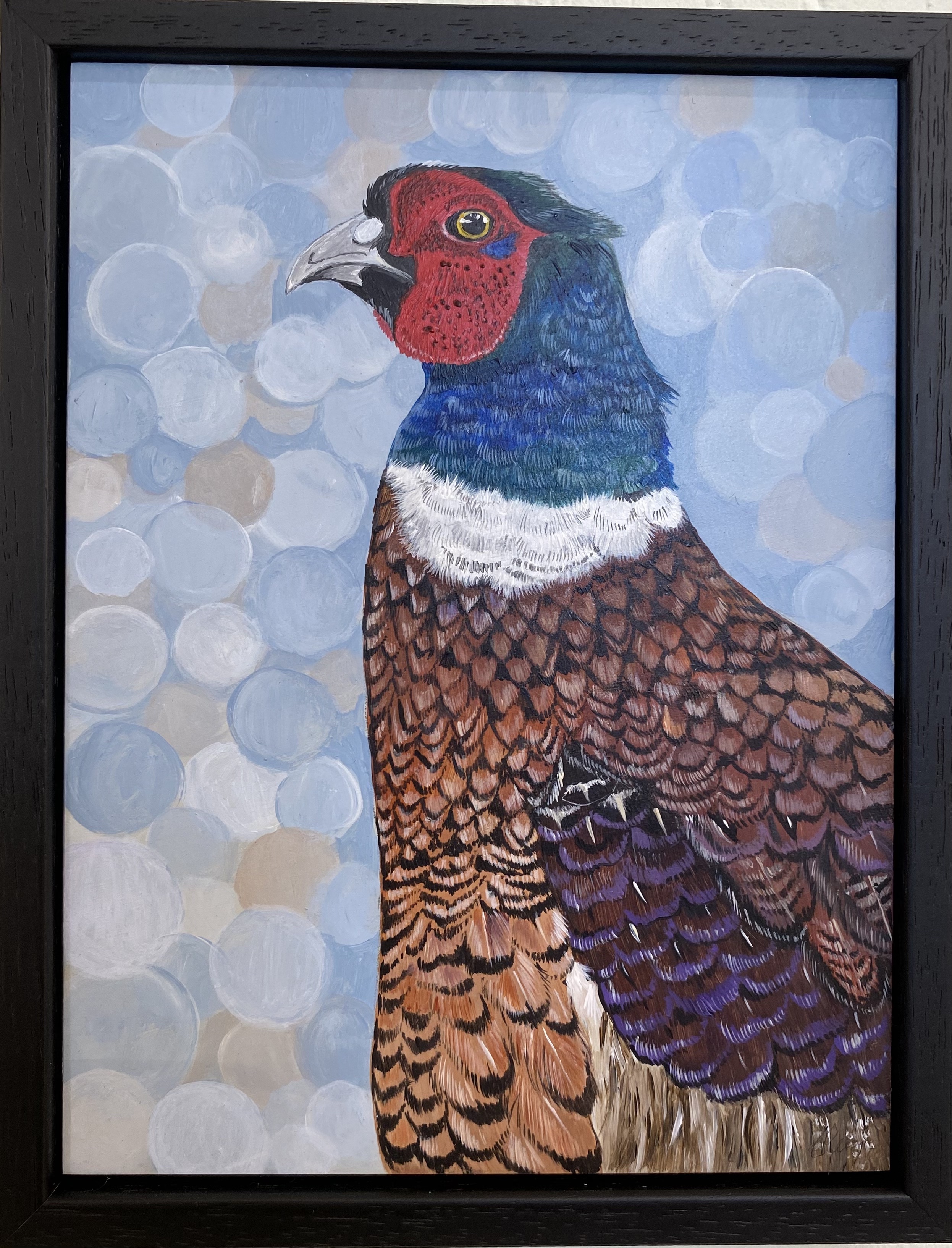 This Pheasant design is on a 3mm aluminium panel, which is an anodised surface, widely considered the best process for the application of acrylic paint. There is no residue from the process, which effectively changes the structure of the aluminium above and below the surface. The panels present a smooth, grey, satin finish and priming is unnecessary as the very fine, regular, porous surface suits fluid paint well. After complete drying and curing the acrylic colour is bonded to the surface. The panel is mounted on a cotton canvas frame.